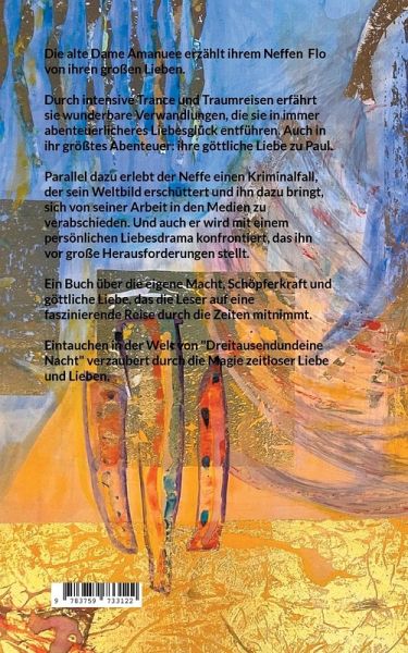 Die alte Dame Amanuee erzählt ihrem Neffen Flo von ihren großen Lieben. Durch intensive Trance und Traumreisen erfährt sie wunder-bare Verwandlungen, die sie in immer abenteuerlicheres Liebesglück entführen. Auch in ihr größtes Abenteuer: ihre göttliche Liebe zu Paul, eine chymische Hochzeit.Parallel dazu erlebt der Neffe einen Kriminalfall, der sein Weltbild erschüttert und ihn dazu bringt, sich von seiner Arbeit in den Medien zu verabschieden. Und auch er wird mit einem persönlichen Liebesdrama konfrontiert, das ihn vor große Herausforderungen stellt.Ein Buch über die eigene Macht, Schöpferkraft und göttliche Liebe, das die Leser auf eine faszinierende Reise durch die Zeiten mitnimmt. Eintauchen in der Welt von "Dreitausendundeine Nacht" verzaubert durch die Magie zeitloser Liebe und Lieben.
