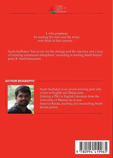DRENCHED BY THE SUN I, who prophesy by reading the stars and the wind, now think of that country ... - excerpt from poem 'Green Sun' Syam Sudhakar 'has an eye for the strange and the uncanny and a way of building translucent metaphors,' according to leading South Indian poet, K. Satchidanandan. Sudhakar's poetry draws on his cultural roots in Kerala as well as the splendor of its natural habitat. Palms, green paddy fields, mountain country, tropical downpours, the sun, the sea, shooting stars and even an enchantress all make their appearance. Sudhakar is an award-winning poet who writes in English and Malayalam. Born in 1983 at Vadanamkurussi village, he was educated in Thrissur and Chennai. He has been widely published and has performed readings at home and abroad, with poems translated into Tamil, Hindi, Bengali, Manipuri, French and Danish. He has five collections to his credit, Earpam (Damp) and Avasanathe Kollimeen (The Last Meteor) in Malayalam, Drenched by the Sun in English, Slicing the Moon (a bilingual video) and Syam Sudhakar Kavithaikal (Poems of Syam Sudhakar) in Tamil, translated by Yuma Vasuki. After completing his Doctorate in English Literature at the University of Madras, Syam Sudhakar is currently based in Kerala, teaching and researching South Indian poetry.
