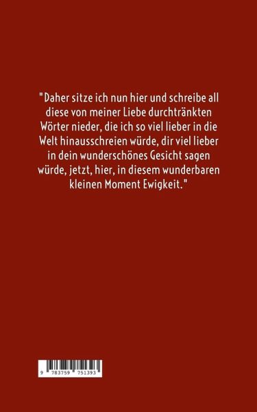 Daher sitze ich nun hier und schreibe all diese von meiner Liebe durchtränkten Wörter nieder, die ich so viel lieber in die Welt hinausschreien würde, dir viel lieber in dein wunderschönes Gesicht sagen würde, jetzt, hier, in diesem wunderbaren kleinen Moment Ewigkeit.