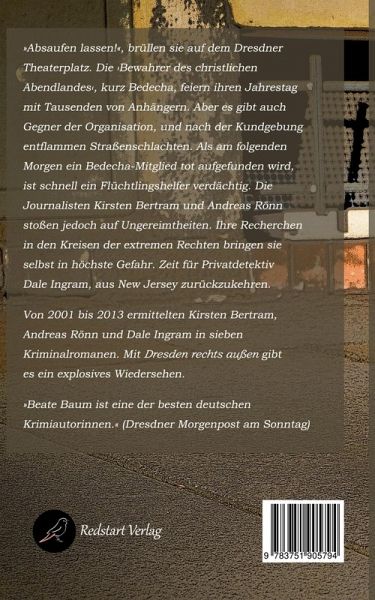 "Absaufen lassen!", brüllen sie auf dem Dresdner Theaterplatz. Die >Bewahrer des christlichen Abendlandes<, kurz Bedecha, feiern ihren Jahrestag mit Tausenden von Anhängern. Aber es gibt auch Gegner der Organisation, und nach der Kundgebung entflammen Straßenschlachten. Als am folgenden Morgen ein Bedecha-Mitglied tot aufgefunden wird, ist schnell ein Flüchtlingshelfer verdächtig. Die Journalisten Kirsten Bertram und Andreas Rönn stoßen jedoch auf Ungereimtheiten. Ihre Recherchen in den Kreisen der extremen Rechten bringen sie selbst in größte Gefahr. Zeit für Privatdetektiv Dale Ingram, aus New Jersey zurückzukehren.Von 2001 bis 2013 ermittelten Kirsten Bertram, Andreas Rönn und Dale Ingram in sieben Kriminalromanen. Mit >Dresden rechts außen< gibt es nun ein explosives Wiedersehen.»Im bitterernsten Kampf gegen Rechts einfach auch mal gut und intelligent zu unterhalten, ist eine nicht zu unterschätzende Kunst. Beate Baum beherrscht sie.« (Verd.di Publik)