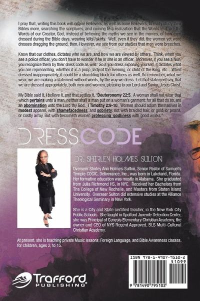 I pray that, writing this book will inspire Believers, as well as none Believers, to really study their Bibles more, searching the scriptures, and coming to a realization that the Words in it, are the Words of our Creator, God, instead of believing the myths we see in the movies, of how men dressed during the Bible days, wearing kilts'/skirts. Well, even if they did, the women yet wore dresses dragging the ground, then. However, we see from our studies that men wore breeches. Know that our clothes, dictates who we are, and how we are viewed by others. Think, when you see a police officer, you don't have to wonder if he or she is an officer. Moreover, if you see a Nun, you recognize them by their dress code as well. So if you dress exposing yourself, it dictates what you are representing, whether it is a pimp, lady of the evening, or child of the King. etc.. When dressed inappropriately, it could be a stumbling block for others as well. So remember, what we wear, we are making a statement without words, by the way we dress. Let that statement say, that we are dressed appropriately, both men and women, pleasing to our Lord and Savior, Jesus Christ. My Bible said it, I believe it, and that settles it, "Deuteronomy 22:5. A woman shall not wear that which pertains unto a man, neither shall a man put on a woman's garment: for all that do so, are an abomination unto the Lord thy God. I Timothy 2:9-10. Women should adorn themselves in modest apparel, with shamefacedness, and sobriety: not with braided hair, or gold, or pearls, or costly array, But with becometh women professing godliness with good works."