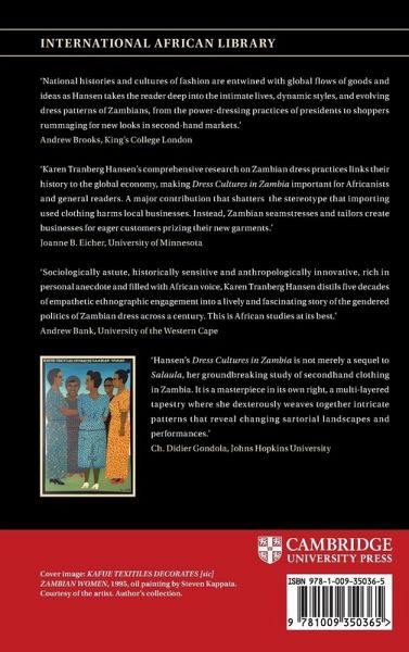 "Dress Cultures in Zambia Drawing on half-a-century of research in Zambia and regional scholarship, Karen Tranberg Hansen offers a vibrant history of changing dress practices from the late-colonial period to the present day. Exploring how the dressed body serves as the point of contact between personal, local, and global experiences, she argues that dress is just as central to political power as it is to personal style. Questioning the idea that the West led fashion trends elsewhere, Hansen demonstrates how local dress conventions appropriated western dress influences as Zambian and shows how Zambia contributed to global fashions, such as the colourful Chitenge fabric that spread across colonial trading networks. Brought to life with colour illustrations and personal anecdotes, this book spotlights dress not only as an important medium through which Zambian identities are negotiated, but also as a key reflector and driver of history. Karen Tranberg Hansen is Professor Emerita at Northwestern University. Her research focuses on the informal economy, clothing, and consumption. Her previous publications include Distant Companions: Servants and Employers in Zambia, 1900-1985 (1989), African Encounters with Domesticity (1992), Keeping House in Lusaka (1997) and Salaula: The World of Secondhand Clothing and Zambia (2000), which was awarded the Anthony Leeds Prize in Urban Anthropology in 2001, and the Society of Economic Anthropology Book Award in 2003. She is the recipient of several book prizes and awards including the Conrad M. Arensberg Award from the Society for the Anthropology of Work in 1997"--