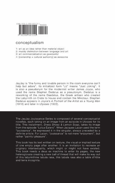 "Dress Shoes & Lemon Soap" is the fifth outing under the JayJay Jouissance Series by Desmond Kon Zhicheng-Mingdé. The JayJay Jouissance Series is composed of several conceptualist novellas, each taking on an image from an episode in Joyce's Ulysses for its title. This installment takes its image from "Lotus Eaters". For Jacques Lacan, "jouissance" is not mere "enjoyment", but rather "painful pleasure". JayJay is "the funny and lovable person in the room everyone can't help but adore". Its initialized form "JJ" means "Just Joking". It is also a pseudonym for the modernist writer James Joyce. This book has its text written on texture, the visual or implied texture of one empty page after another. It is an invitation to fill in the blanks.