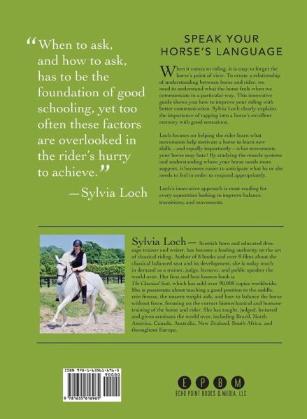 Speak Your Horse's Language When it comes to riding, it is easy to forget the horse’s point of view. To create a relationship of understanding between horse and rider, we need to understand what the horse feels when we communicate in a particular way. This innovative guide shows you how to improve your riding with better communication. Sylvia Loch clearly explains the importance of tapping into a horse’s excellent memory with good sensations. Loch focuses on helping the rider learn what movements help motivate a horse to learn new skills—and equally importantly--what feelings your horse may hate! By studying the muscle systems and understanding where your horse needs more support, it becomes easier to anticipate what he or she needs to feel in order to respond appropriately. Loch’s innovative approach is must reading for every equestrian looking to improve transitions, exercises and movements. "When to ask, and how to ask, has to be the foundation of good schooling, yet too often these factors are overlooked in the rider’s hurry to achieve."-Sylvia Loch