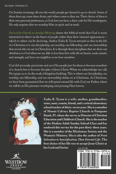 On Sunday mornings all over the world, people get dressed to go to church. Some of them dress up, some dress down, and others come as they are. Their choice of dress is their own personal preferences, as God does not have a dress code for His worshippers. He only requires that we worship Him in spirit and in truth. Dressed for Church on Sunday Morning shares the biblical truth that God is more interested in what's in the heart of people rather than their outward appearances-which to others can be deceiving. Author Zadia B. Tyson reminds us that in the life of a Christian, it is our discipleship, our worship, our fellowship, and our stewardship that reveal who we are in Christ Jesus. It is through these disciplines that we show our obedience to God when we are able to love him first with all our hearts, souls, minds, and strength, and love our neighbor as we love ourselves. God did not make provisions and save His people just for them to become members of a church; but to become disciples of Jesus Christ. When we acknowledge our call, He equips us to do the work of kingdom building. This is where our discipleship, our worship, our fellowship, and our stewardship define us as Christians. As Christians, we have been guaranteed that we will spend eternal life with God our Father, where we will be in His presence worshiping and praising Him forever.