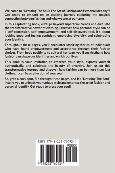 Welcome to "Dressing The Soul: The Art of Fashion and Personal Identity"! Get ready to embark on an exciting journey exploring the magical connection between fashion and who we are at our core. In this captivating book, we'll go beyond superficial trends and dive into the transformative power of clothing. Discover how personal style can be a self-expression, self-empowerment, and self-discovery tool. It's about looking good and feeling confident, embracing diversity, and celebrating your identity. Throughout these pages, you'll encounter inspiring stories of individuals who have found empowerment and acceptance through their fashion choices. From body positivity to cultural heritage, you'll see firsthand how fashion can shape our identities and enrich our lives. This book is your invitation to embrace your style, express yourself authentically, and celebrate the beauty of diversity. Join us on this transformative journey and discover how fashion can be more than just clothes, it can be a reflection of your soul. So, grab a cozy spot, flip through these pages, and let "Dressing The Soul" inspire you to unleash your unique style and embrace the art of fashion and personal identity. Get ready to dress your soul!