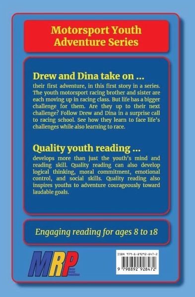 Drew and Dina take on ... their first adventure, in this first story in a series. The youth motorsport racing brother and sister are each moving up in racing class. But life has a bigger challenge for them. Are they up to their next challenge? Follow Drew and Dina in a surprise call to racing school. See how they learn to face life's challenges while also learning to race. Quality youth reading ... develops more than just the youth's mind and reading skill. Quality reading can also develop logical thinking, moral commitment, emotional control, and social skills. Quality reading also inspires youths to adventure courageously toward laudable goals.