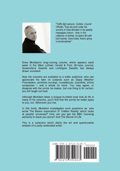 Drew McAdam's long-running column, which appears each week in the West Lothian Herald, Bo'ness Journal and Linlithgow Gazette has always drawn comment. Now the columns are available to a wider audience, who can appreciate his take on subjects such as Dippy Weather Forecasters, pointless surveys, roundabouts, scientists, airline companies - and a whole lot more. In this book, McAdam investigates such questions as: who wrote The Beano exploration of parallel universes. How can you get the BBC licensing authority to leave you alone. And The Secret of Life. This is a collection which distils the wit and questionable wisdom of a justly celebrated writer. "Traffic light sensors. Cyclists. Council Officials. They all come under the scrutiny of Drew McAdam in his weekly newspaper column. Now, in this collection of articles, he opens fire with both barrels. Stand clear, there's going to be bloodshed."