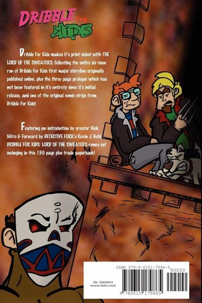 Dribble For Kids makes it's print-debut with THE LORD OF THE SWEATERS! Collecting the entire six-issue run of D4K's first major storyline found originally online (www.dribbleforkids.com), THE LORD OF THE SWEATERS tells the story of a small group of friends as they fend together to fight an unstoppable evil- -A Turtleneck Sweater. Featuring an introduction by creator Nick Nitro & Forward by DETECTIVE FORK's Kevin J. Guhl, DRIBBLE FOR KIDS: LORD OF THE SWEATERS comes out swinging in this 160 page plus trade paperback!
