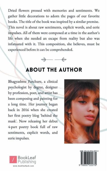 ""Dried flowers pressed with memories and sentiments. We gather little decorations to adorn the pages of our favorite books. The title of the book was inspired by a similar premise. This compilation is about raw sentiments, explicit words, and eerie impulses. All of them were composed at a time in the author's life when she needed an escape from reality but also was infatuated with it. This composition, she believes, must be experienced before it can be comprehended.""