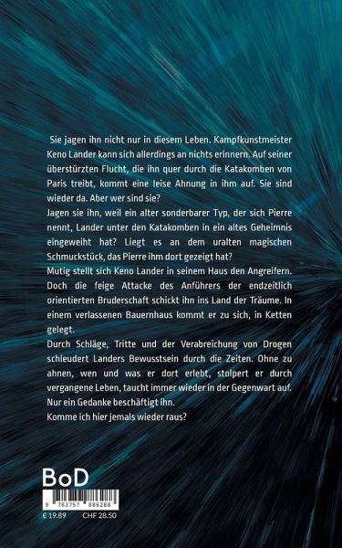Sie jagen ihn. Sie jagen ihn nicht nur in diesem Leben. Kampfkunstmeister Keno Lander kann sich allerdings an nichts erinnern. Auf seiner überstürzten Flucht, die ihn quer durch die Katakomben von Paris treibt, kommt eine leise Ahnung in ihm auf. Sie sind wieder da. Aber wer sind sie?Jagen sie ihn, weil ein alter sonderbarer Typ, der sich Pierre nennt, Lander unter den Katakomben in ein altes Geheimnis eingeweiht hat? Liegt es an dem uralten magischen Schmuckstück, das Pierre ihm dort gezeigt hat?Mutig stellt sich Keno Lander in seinem Haus den Angreifern. Doch die feige Attacke des Anführers der endzeitlich orientierten Bruderschaft schickt ihn ins Land der Träume. In einem verlassenen Bauernhaus kommt er zu sich, in Ketten gelegt. Durch Schläge, Tritte und der Verabreichung von Drogen schleudert Landers Bewusstsein durch die Zeiten. Ohne zu ahnen, wen und was er dort erlebt, stolpert er durch vergangene Leben, taucht immer wieder in der Gegenwart auf.Nur ein Gedanke beschäftigtihn. Komme ich hier jemals wieder raus?