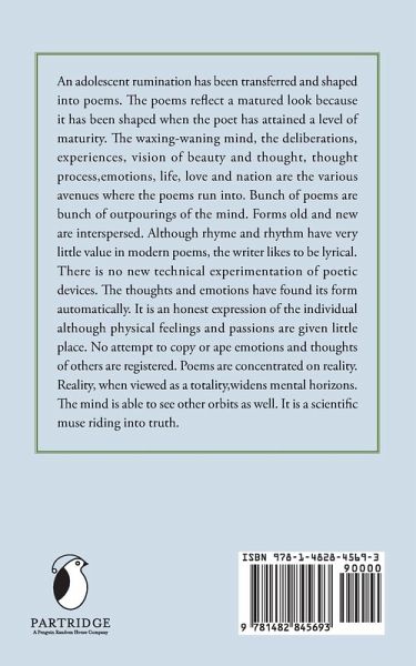 An adolescent rumination has been transferred and shaped into poems. The poems reflect a matured look because it has been shaped when the poet has attained a level of maturity. The waxing-waning mind, the deliberations, experiences, vision of beauty and thought, thought process,emotions, life, love and nation are the various avenues where the poems run into. Bunch of poems are bunch of outpourings of the mind. Forms old and new are interspersed. Although rhyme and rhythm have very little value in modern poems, the writer likes to be lyrical. There is no new technical experimentation of poetic devices. The thoughts and emotions have found its form automatically. It is an honest expression of the individual although physical feelings and passions are given little place. No attempt to copy or ape emotions and thoughts of others are registered. Poems are concentrated on reality. Reality, when viewed as a totality,widens mental horizons. The mind is able to see other orbits as well. It is a scientific muse riding into truth.