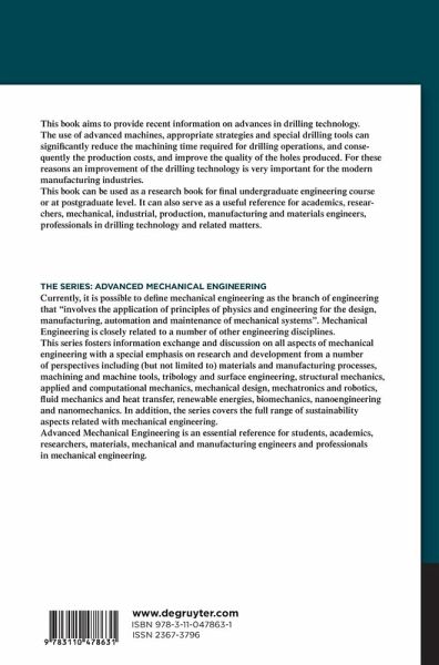 This book aims to provide recent information on advances in drilling technology. The use of advanced machines, appropriate strategies and special drilling tools can signifi cantly reduce the machining time required for drilling operations, and consequently the production costs, and improve the quality of the holes produced. For these reasons an improvement of the drilling technology is very important for the modern manufacturing industries. This book can be used as a research book for fi nal undergraduate engineering course or at postgraduate level. It can also serve as a useful reference for academics, researchers, mechanical, industrial, production, manufacturing and materials engineers, professionals in drilling technology and related matters.