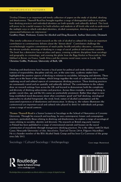 1. Introduction. Drinking Dilemmas?: Space culture and identity Thomas Thurnell-Read 2. Revisiting Urban Nightscapes: An Academic and personal journey through twenty years of nightlife research Robert Hollands 3. The Symbolic Value of Alcohol: The importance of alcohol consumption drinking practices and drinking spaces in classed and gendered identity construction Kimberley Ross-Houle Amanda Atkinson and Harry Sumnall 4. Beer and Belonging: Real ale consumption place and identity Thomas Thurnell-Read 5. Illegal Drinking Venues in a South African Township: Sites of struggle in the informal city Andrew Charman 6. 'Eat Drink and Be Merry for Tomorrow We Die': Alcohol practices in Mar Mikhael Beirut Marie Bonte 7. 'A Force to be Reckoned With': The Role and Influence of Alcohol in Leeds' Extreme Metal Scene Gabby Riches 8. 'Never Ever Go Down the Bigg Market': Classed and spatialised processes of othering on the 'girls' night out' Emily Nicholls 9. Young People's Alcohol-Related Urban Im/mobilities Samantha Wilkinson 10. Parenting Style and Gender Effects on Alcohol Consumptions among University Students in France Ludovic Gaussot Loïc Le Minor and Nicolas Palierne 11. Growing up Going out: Cultural and aesthetic attachment to the night time economy Oliver Smith 12. 'There Are Limits on What You Can Do': Biographical reconstruction by those bereaved by alcohol-related deaths Christine Valentine Lorna Templeton and Richard Velleman 13. Drinking Dilemmas: Making a difference? Mark Jayne and Gill Valentine