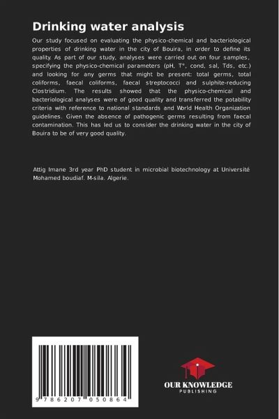 Our study focused on evaluating the physico-chemical and bacteriological properties of drinking water in the city of Bouira, in order to define its quality. As part of our study, analyses were carried out on four samples, specifying the physico-chemical parameters (pH, T°, cond, sal, Tds, etc.) and looking for any germs that might be present: total germs, total coliforms, faecal coliforms, faecal streptococci and sulphite-reducing Clostridium. The results showed that the physico-chemical and bacteriological analyses were of good quality and transferred the potability criteria with reference to national standards and World Health Organization guidelines. Given the absence of pathogenic germs resulting from faecal contamination. This has led us to consider the drinking water in the city of Bouira to be of very good quality.