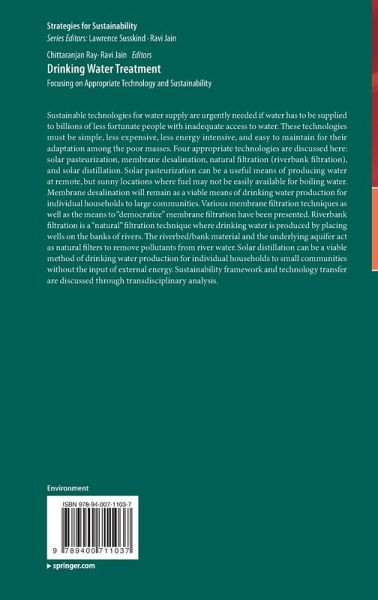This book examines four sustainable drinking water treatment technologies that are simple, non-energy intensive, inexpensive and easy to maintain: solar pasteurization, membrane desalination, natural filtration (riverbank filtration), and solar distillation.