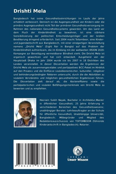 Bangladesch hat seine Gesundheitseinrichtungen im Laufe der Jahre erheblich verbessert. Dennoch ist die Augengesundheit von Kindern oder die primäre Augengesundheit nicht Teil der primären Gesundheitsversorgung im Rahmen des nationalen Gesundheitssystems geworden. Um das Land vor dem Fluch der Kinderblindheit zu bewahren, ist eine stärkere Sensibilisierung der politischen Entscheidungsträger und der breiten Bevölkerung dringend erforderlich. Seit 2004 macht Toitomboor, eine Kinder- und Jugendzeitschrift aus Bangladesch, mit einer einzigartigen Veranstaltung namens "Drishti Mela" (Sight Fair in Bangla) auf das Problem der Kinderblindheit aufmerksam, die im Einklang mit der weltweiten VISION 2020-Kampagne zur Beseitigung vermeidbarer Blindheit steht. Die Drishti Mela ist organisch gewachsen und hat sich entwickelt. Ausgehend von der Hauptstadt Dhaka im Jahr 2004 wurde sie bis 2007 in 18 Distrikten des Landes veranstaltet. In dieser Dissertation werden die Ergebnisse der Drishti Mela als zusammengesetztes und partizipatives BCC-Paket im Hinblick auf den Prozess und die Einflüsse sozioökonomischer, kultureller, religiöser und behinderungsbedingter Faktoren untersucht, durch die die Aktivitäten zu sozialem Verständnis und möglichen gesundheitlichen Ergebnissen führen. Die Dissertation zielt darauf ab, die Kosteneffizienz sowie die partizipatorischen und sozialen Befähigungsmerkmale von Drishti Mela zu bewerten und zu empfehlen.