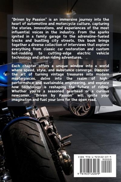 "Driven by Passion" is an immersive journey into the heart of automotive and motorcycle culture, capturing the stories, innovations, and experiences of the most influential voices in the industry. From the sparks ignited in a family garage to the adrenaline-fueled tracks and bustling city streets, this book brings together a diverse collection of interviews that explore everything from classic car restoration and custom hot-rodding to cutting-edge electric vehicle technology and urban riding adventures. Each chapter offers a unique window into a world where speed, style, and substance converge. Discover the art of turning vintage treasures into modern masterpieces, delve into the realm of high-performance and sustainable engineering, and explore how technology is reshaping the future of riding. Whether you're a seasoned gearhead or a curious newcomer, "Driven by Passion" will ignite your imagination and fuel your love for the open road.