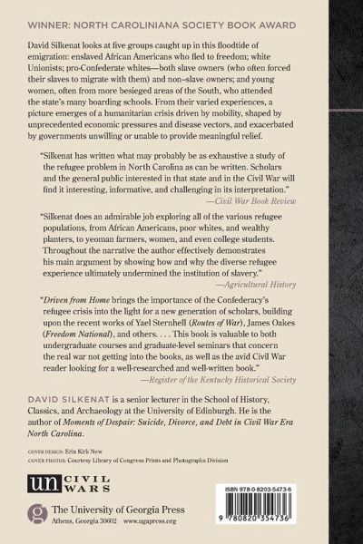 Examining refugees of Civil War-era North Carolina, Driven from Home reveals the complexity and diversity of the war's displaced populations and the inadequate responses of governmental and charitable organizations as refugees scrambled to secure the necessities of daily life. In North Carolina, writes David Silkenat, the relative security of the Piedmont and mountains drew pro-Confederate elements from across the region. Early in the war, Union invaders established strongholds on the coast, to which their sympathizers fled in droves. Silkenat looks at five groups caught up in this floodtide of emigration: enslaved African Americans who fled to freedom; white Unionists; pro-Confederate whites--both slave owners (who often forced their slaves to migrate with them) and non-slave owners; and young women, often from more besieged areas of the South, who attended the state's many boarding schools. From their varied experiences, a picture emerges of a humanitarian crisis driven by mobility, shaped by unprecedented economic pressures and disease vectors, and exacerbated by governments unwilling or unable to provide meaningful relief. For anyone seeking context to current refugee crises, Driven from Home has much to say about the crushing administrative and logistical challenges of aid work, the illusory nature of such concepts as home fronts and battle lines, and the ongoing debate over links between relief and dependence.