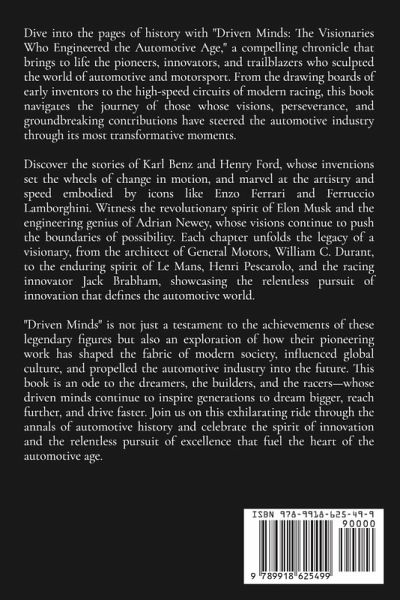 Dive into the pages of history with "Driven Minds: The Visionaries Who Engineered the Automotive Age," a compelling chronicle that brings to life the pioneers, innovators, and trailblazers who sculpted the world of automotive and motorsport. From the drawing boards of early inventors to the high-speed circuits of modern racing, this book navigates the journey of those whose visions, perseverance, and groundbreaking contributions have steered the automotive industry through its most transformative moments. Discover the stories of Karl Benz and Henry Ford, whose inventions set the wheels of change in motion, and marvel at the artistry and speed embodied by icons like Enzo Ferrari and Ferruccio Lamborghini. Witness the revolutionary spirit of Elon Musk and the engineering genius of Adrian Newey, whose visions continue to push the boundaries of possibility. Each chapter unfolds the legacy of a visionary, from the architect of General Motors, William C. Durant, to the enduring spirit of Le Mans, Henri Pescarolo, and the racing innovator Jack Brabham, showcasing the relentless pursuit of innovation that defines the automotive world. "Driven Minds" is not just a testament to the achievements of these legendary figures but also an exploration of how their pioneering work has shaped the fabric of modern society, influenced global culture, and propelled the automotive industry into the future. This book is an ode to the dreamers, the builders, and the racers-whose driven minds continue to inspire generations to dream bigger, reach further, and drive faster. Join us on this exhilarating ride through the annals of automotive history and celebrate the spirit of innovation and the relentless pursuit of excellence that fuel the heart of the automotive age.