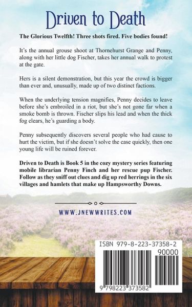 The Glorious Twelfth! Three shots fired. Five bodies found! It's the annual grouse shoot at Thornehurst Grange and Penny, along with her little dog Fischer, takes her annual walk to protest at the gate. Hers is a silent demonstration, but this year the crowd is bigger than ever and, unusually, made up of two distinct factions. When the underlying tension magnifies, Penny decides to leave before she's embroiled in a riot, but she's not gone far when a smoke bomb is thrown. Fischer slips his lead and when the thick fog clears, he's guarding a body. Penny subsequently discovers several people who had cause to hurt the victim, but if she doesn't solve the case quickly, then one young life will be ruined forever. Driven to Death is Book 5 in the cozy mystery series featuring mobile librarian Penny Finch and her rescue pup Fischer. Follow as they sniff out clues and dig up red herrings in the six villages and hamlets that make up Hampsworthy Downs.