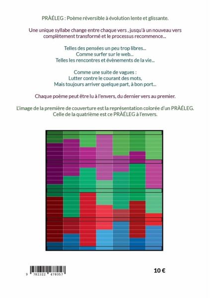 PRAELEG : Poème réversible à évolution lente et glissante. Une unique syllabe change entre chaque vers (avec quelques très légères tolérances), jusqu'à un nouveau vers complètement transformé (en gras) et le processus recommence... Telles des pensées un peu trop libres... Comme surfer sur le web... Telles les rencontres et évènements de la vie... Comme une suite de vagues... Lutter contre le courant des mots. Mais toujours arriver quelque part. Chaque poème peut être lu à l'envers, du dernier vers au premier.