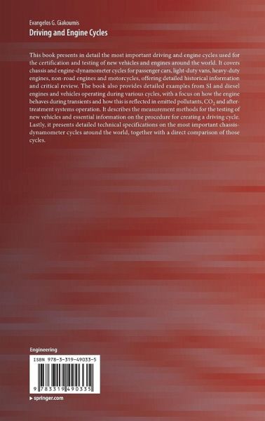 This book presents in detail the most important driving and engine cycles used for the certification and testing of new vehicles and engines around the world. It covers chassis and engine-dynamometer cycles for passenger cars, light-duty vans, heavy-duty engines, non-road engines and motorcycles, offering detailed historical information and critical review. The book also provides detailed examples from SI and diesel engines and vehicles operating during various cycles, with a focus on how the engine behaves during transients and how this is reflected in emitted pollutants, CO2 and after-treatment systems operation. It describes the measurement methods for the testing of new vehicles and essential information on the procedure for creating a driving cycle. Lastly, it presents detailed technical specifications on the most important chassis-dynamometer cycles around the world, together with a direct comparison of those cycles.