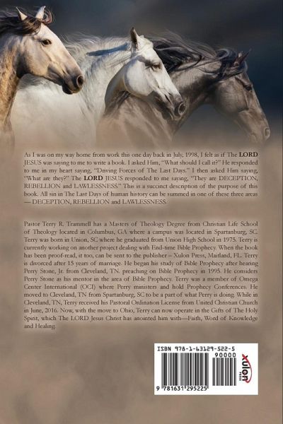 As I was on my way home from work this one day back in July, 1998, I felt as if The LORD JESUS was saying to me to write a book. I asked Him, "What should I call it?" He responded to me in my heart saying, "Driving Forces of The Last Days." I then asked Him saying, "What are they?" The LORD JESUS responded to me saying, "They are DECEPTION, REBELLION and LAWLESSNESS." This is a succinct description of the purpose of this book. All sin in The Last Days of human history can be summed in one of these three areas -- DECEPTION, REBELLION and LAWLESSNESS. Pastor Terry R. Trammell has a Masters of Theology Degree from Christian Life School of Theology located in Columbus, GA where a campus was located in Spartanburg, SC. Terry was born in Union, SC where he graduated from Union High School in 1975. Terry is currently working on another project dealing with End-time Bible Prophecy. When the book has been proof-read, it too, can be sent to the publisher - Xulon Press, Maitland, FL. Terry is divorced after 15 years of marriage. He began his study of Bible Prophecy after hearing Perry Stone, Jr. from Cleveland, TN. preaching on Bible Prophecy in 1995. He considers Perry Stone as his mentor in the area of Bible Prophecy. Terry was a member of Omega Center International (OCI) where Perry ministers and hold Prophecy Conferences. He moved to Cleveland, TN from Spartanburg, SC to be a part of what Perry is doing. While in Cleveland, TN, Terry received his Pastoral Ordination License from United Christian Church in June, 2016. Now, with the move to Ohio, Terry can now operate in the Gifts of The Holy Spirit, which The LORD Jesus Christ has anointed him with--Faith, Word of Knowledge and Healing.