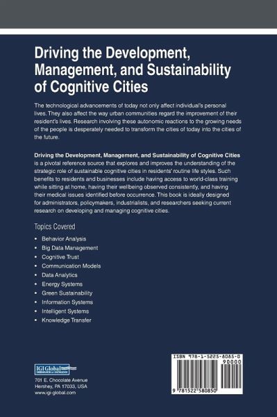 The technological advancements of today not only affect individual's personal lives. They also affect the way urban communities regard the improvement of their resident's lives. Research involving these autonomic reactions to the growing needs of the people is desperately needed to transform the cities of today into the cities of the future. Driving the Development, Management, and Sustainability of Cognitive Cities is a pivotal reference source that explores and improves the understanding of the strategic role of sustainable cognitive cities in residents' routine life styles. Such benefits to residents and businesses include having access to world-class training while sitting at home, having their wellbeing observed consistently, and having their medical issues identified before occurrence. This book is ideally designed for administrators, policymakers, industrialists, and researchers seeking current research on developing and managing cognitive cities.