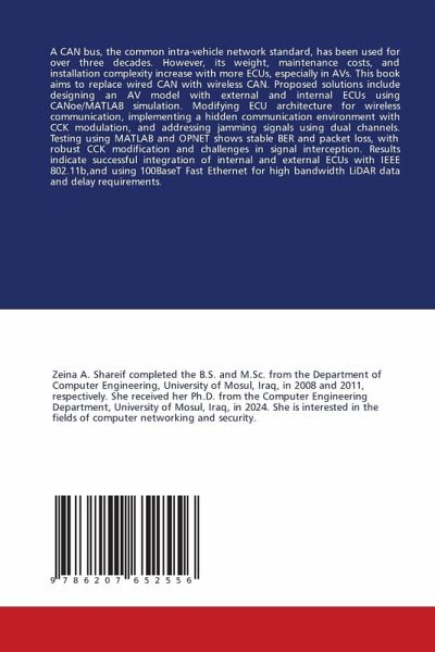 A CAN bus, the common intra-vehicle network standard, has been used for over three decades. However, its weight, maintenance costs, and installation complexity increase with more ECUs, especially in AVs. This book aims to replace wired CAN with wireless CAN. Proposed solutions include designing an AV model with external and internal ECUs using CANoe/MATLAB simulation. Modifying ECU architecture for wireless communication, implementing a hidden communication environment with CCK modulation, and addressing jamming signals using dual channels. Testing using MATLAB and OPNET shows stable BER and packet loss, with robust CCK modification and challenges in signal interception. Results indicate successful integration of internal and external ECUs with IEEE 802.11b,and using 100BaseT Fast Ethernet for high bandwidth LiDAR data and delay requirements.