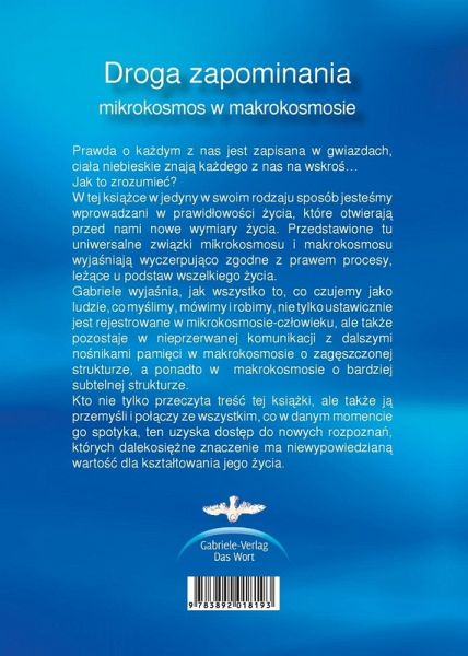 Gwiazdy nie k¿ami¿! W niezliczonych planetarnych konstelacjach, gwiazdy kosmosu materialnego i niewidzialny dla nas makrokosmos przechowuj¿ wszelkie emocje, wszystko co przemawia za cz¿owiekiem i przeciwko niemu. Jedna energetyczna pow¿oka po drugiej, jedna szata duszy po drugiej, pojawia si¿ podczas w¿drówki duszy i sygnalizuje, co nale¿y rozpoznä i pokonä. Duszy - na jej drogach do coraz doskonalszych energii ¿wietlnych - towarzysz¿ i doradzaj¿ wy¿sze istoty. Wszystko, co jeszcze trzyma si¿ jäniej¿cej duszy, ma ona rozpoznä i od¿o¿y¿.... "Dusza ¿yje w innym wymiarze, który jest bardziej subtelny. Równie¿ nawyki, które naby¿a jako cz¿owiek, zachowuje na d¿ugo. Wszystkie dziäania s¿ energi¿ przechowywan¿ w makrokosmosie. Wszystko, co nale¿y do cz¿owieka, do ¿wiata w trzech wymiarach, dusza przenosi ze sob¿ do innego ¿wiata, do zäwiatów - i musi od¿o¿y¿ na drodze zapominania..." Gabriele wyjänia zwi¿zki i procesy ¿yciowe, które w wi¿kszo¿ci przypadków s¿ jeszcze nieznane, ale decyduj¿ce dla ksztätowania naszych dni na Ziemi.