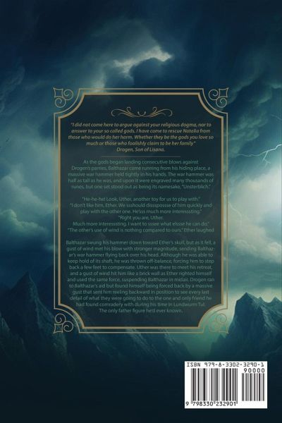 "I did not come here to argue against your religious dogma, nor to answer to your so called gods. I have come to rescue Natalia from those who would do her harm. Whether they be the gods you love so much or those who foolishly claim to be her family." Drogen, Son of Lisana As the gods began landing consecutive blows against Drogen's parries, Balthazar came running from his hiding place, a massive war hammer held tightly in his hands. The war hammer was half as tall as he was, and upon it were engraved many thousands of runes, but one set stood out as being its namesake, "Unsterblich." "He-he-he! Look, Uther, another toy for us to play with." "I don't like him, Ether. We ssshould dissspossse of him quickly and play with the other one.He'sss much more interesssting." "Right you are, Uther. Much more interesssting. I want to sssee what elssse he can do." "The other's use of wind is nothing compared to ours." Ether laughed Balthazar swung his hammer down toward Ether's skull, but as it fell, a gust of wind met his blow with stronger magnitude, sending Balthazar's war hammer flying back over his head. Although he was able to keep hold of its shaft, he was thrown off-balance, forcing him to step back a few feet to compensate. Uther was there to meet his retreat, and a gust of wind hit him like a brick wall as Ether righted himself and used the same force, suspending Balthazar in midair. Drogen ran to Balthazar's aid but found himself being forced back by a massive gust that sent him reeling backward in position to see every last detail of what they were going to do to the one and only friend he had found comradery with during his time in Lundwurm Tul. The only father figure he'd ever known.