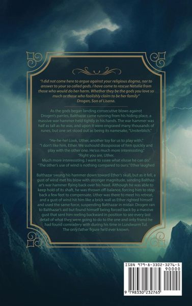 "I did not come here to argue against your religious dogma, nor to answer to your so called gods. I have come to rescue Natalia from those who would do her harm. Whether they be the gods you love so much or those who foolishly claim to be her family." Drogen, Son of Lisana As the gods began landing consecutive blows against Drogen's parries, Balthazar came running from his hiding place, a massive war hammer held tightly in his hands. The war hammer was half as tall as he was, and upon it were engraved many thousands of runes, but one set stood out as being its namesake, "Unsterblich." "He-he-he! Look, Uther, another toy for us to play with." "I don't like him, Ether. We ssshould dissspossse of him quickly and play with the other one.He'sss much more interesssting." "Right you are, Uther. Much more interesssting. I want to sssee what elssse he can do." "The other's use of wind is nothing compared to ours." Ether laughed Balthazar swung his hammer down toward Ether's skull, but as it fell, a gust of wind met his blow with stronger magnitude, sending Balthazar's war hammer flying back over his head. Although he was able to keep hold of its shaft, he was thrown off-balance, forcing him to step back a few feet to compensate. Uther was there to meet his retreat, and a gust of wind hit him like a brick wall as Ether righted himself and used the same force, suspending Balthazar in midair. Drogen ran to Balthazar's aid but found himself being forced back by a massive gust that sent him reeling backward in position to see every last detail of what they were going to do to the one and only friend he had found comradery with during his time in Lundwurm Tul. The only father figure he'd ever known.