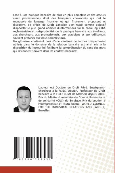 Face à une pratique bancaire de plus en plus complexe et des acteurs assez professionnels dont des banquiers chevronnés qui ont le monopole du langage financier et qui finalement proposent et disposent, ce précis de Droit Bancaire s'est tracé comme objectif d'apporter le plus grand nombre d'informations sur le cadre législatif, réglementaire et jurisprudentiel de la pratique bancaire aux étudiants, aux chercheurs, aux professionnels, aux praticiens et aux utilisateurs souvent profanes que nous sommes tous. Un glossaire contenant près d'une centaine de termes fréquemment utilisés dans le domaine de la relation bancaire est ainsi mis à la disposition du lecteur lui facilitant la compréhension du sens des mots qui reviennent souvent dans les contrats bancaires.