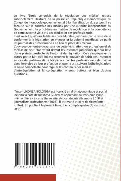 Le livre "Droit congolais de la régulation des médias" retrace succinctement l'histoire de la presse en République Démocratique du Congo, du monopole gouvernemental à la libéralisation du secteur. Il se focalise sur le contrôle des médias par une autorité indépendante du Gouvernement, la procédure en matière de régulation et la compétence de cette autorité vis-à-vis des médias et des professionnels. Il est relevé quelques faiblesses procédurales, justifiées par le refus de se conformer à la législation en vigueur et la volonté manifeste de punir les journalistes professionnels en lieu et place des médias. L'ouvrage démontre qu'au sens de cette législation, un professionnel de médias ne peut être attrait devant les instances judiciaires que sur base d'une plainte préalable de l'autorité de régulation. Cela s'explique entre autres par le fait qu'il lui est reconnu le pouvoir de saisir ces instances en cas de violation de la loi pénale par les professionnels de médias dans l'exercice de leur profession et qu'elle est, suivant ladite législation, la seule compétente pour réguler les contenus des médias. L'autorégulation et la corégulation y sont traitées et bien d'autres questions.