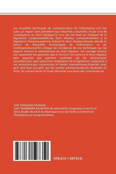 Les nouvelles techniques de communication de l'information ont fait subir un impact sans précédent aux industries culturelles; et par voie de conséquence au droit d'auteur.Ce livre qui est basé sur l'analyse de la législation congolaise(RDC)du droit d'auteur comparativement à la législation française,examine d'abord le droit d'auteur,ensuite aborde la notion de Nouvelles Technologies de l'Information et de Communication,enfin indique les incidences de ces techniques sur les aspects moraux et patrimoniaux du droit d'auteur. cet ouvrage énonce non seulement les garanties que le droit,en l'occurrence le droit d'auteur peut apporter aux question soulevées par les technologies nouvelles;mais aussi préconise l'adaptation de la législation congolaise à ces évolutions,aux conventions et traités internationaux.Espérant ainsi qu'il sera bien accueilli par les juristes professionnels,les étudiants en droit, les universitaires et toute personne soucieuse des connaissances.