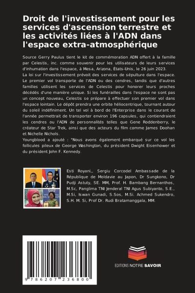 Source Gerry Paulus tient le kit de commémoration ADN offert à la famille par Celestis, inc. comme souvenir pour les utilisateurs de leurs services d'inhumation dans l'espace, à Mesa, Arizona, États-Unis, le 26 juin 2023. La loi sur l'investissement prévoit des services de sépulture dans l'espace. Le premier vol transporte de l'ADN ou des cendres, tandis que d'autres familles utilisent les services de Celestis pour honorer leurs proches décédés d'une manière unique. Si les funérailles dans l'espace ne sont pas un concept nouveau, Celestis se prépare à effectuer son premier vol dans l'espace lointain. Le dépôt prendra une orbite héliocentrique, tournant autour du soleil indéfiniment. Un tel vol à bord de l'Enterprise dans le courant de l'année permettrait de transporter environ 196 capsules, qui contiendraient les cendres ou l'ADN de personnalités telles que Gene Roddenberry, le créateur de Star Trek, ainsi que des acteurs du film comme James Doohan et Nichelle Nichols.Youngblood a ajouté : "Nous avons également embarqué sur ce vol les follicules pileux de George Washington, du président Dwight Eisenhower et du président John F. Kennedy.