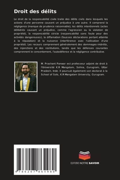 Le droit de la responsabilité civile traite des délits civils dans lesquels les actions d'une personne causent un préjudice à une autre. Il comprend la négligence (manque de prudence raisonnable), les délits intentionnels (actes délibérés causant un préjudice, comme l'agression ou la violation de propriété), la responsabilité stricte (responsabilité sans faute pour des activités dangereuses), la diffamation (fausses déclarations portant atteinte à la réputation) et la nuisance (interférence avec l'utilisation d'une propriété). Les recours comprennent généralement des dommages-intérêts, des injonctions et des restitutions, tandis que les défenses courantes comprennent le consentement, l'autodéfense et la négligence contributive.