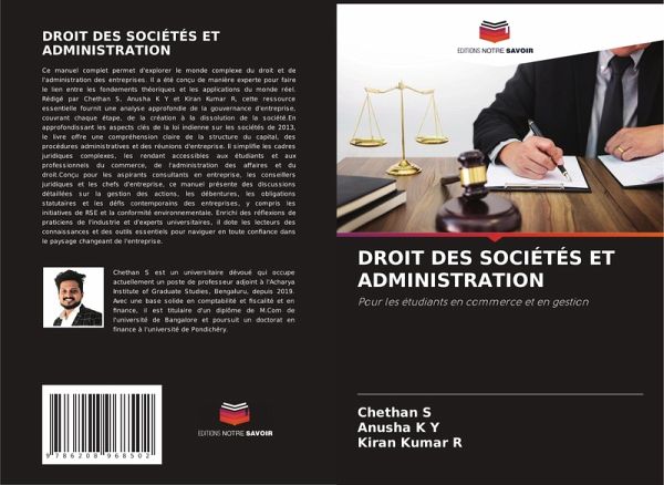 Ce manuel complet permet d'explorer le monde complexe du droit et de l'administration des entreprises. Il a été conçu de manière experte pour faire le lien entre les fondements théoriques et les applications du monde réel. Rédigé par Chethan S, Anusha K Y et Kiran Kumar R, cette ressource essentielle fournit une analyse approfondie de la gouvernance d'entreprise, couvrant chaque étape, de la création à la dissolution de la société.En approfondissant les aspects clés de la loi indienne sur les sociétés de 2013, le livre offre une compréhension claire de la structure du capital, des procédures administratives et des réunions d'entreprise. Il simplifie les cadres juridiques complexes, les rendant accessibles aux étudiants et aux professionnels du commerce, de l'administration des affaires et du droit.Conçu pour les aspirants consultants en entreprise, les conseillers juridiques et les chefs d'entreprise, ce manuel présente des discussions détaillées sur la gestion des actions, les débentures, les obligations statutaires et les défis contemporains des entreprises, y compris les initiatives de RSE et la conformité environnementale. Enrichi des réflexions de praticiens de l'industrie et d'experts universitaires, il dote les lecteurs des connaissances et des outils essentiels pour naviguer en toute confiance dans le paysage changeant de l'entreprise.