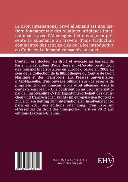 Le droit international privé allemand est une matière fondamentale des relations juridiques internationales avec l Allemagne. Cet ouvrage en présente la substance au travers d une traduction commentée des articles clés de la loi introductive au Code civil allemand consacrés au sujet. L auteur est docteur en droit et avocate au barreau de Paris. Elle est auteur d une thèse sur "L évolution du droit des transports ferroviaires en Europe", parue en 2008 au sein de la Collection de la Bibliothèque du Centre de Droit Maritime et des Transports, aux Presses universitaires d Aix-Marseille, d un ouvrage bilingue sur "La réserve de propriété de droit français et de droit allemand dans le contexte européen Une contribution au droit international de l insolvabilité"/"Der Eigentumsvorbehalt des deutschen und französischen Rechts im europäischen Kontext Zugleich ein Beitrag zum internationalen Insolvenzrecht", paru en 2011 aux éditions Peter Lang, d un livre sur "L essentiel du droit des transports", paru en 2012 aux éditions Lextenso-Gualino.