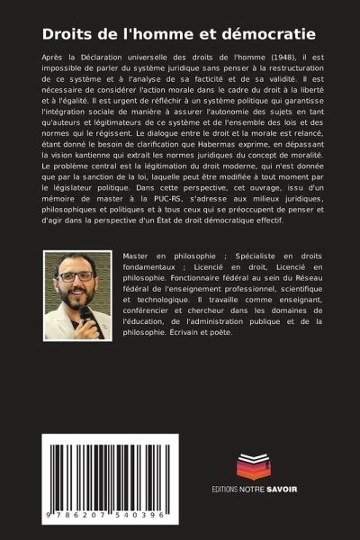 Après la Déclaration universelle des droits de l'homme (1948), il est impossible de parler du système juridique sans penser à la restructuration de ce système et à l'analyse de sa facticité et de sa validité. Il est nécessaire de considérer l'action morale dans le cadre du droit à la liberté et à l'égalité. Il est urgent de réfléchir à un système politique qui garantisse l'intégration sociale de manière à assurer l'autonomie des sujets en tant qu'auteurs et légitimateurs de ce système et de l'ensemble des lois et des normes qui le régissent. Le dialogue entre le droit et la morale est relancé, étant donné le besoin de clarification que Habermas exprime, en dépassant la vision kantienne qui extrait les normes juridiques du concept de moralité. Le problème central est la légitimation du droit moderne, qui n'est donnée que par la sanction de la loi, laquelle peut être modifiée à tout moment par le législateur politique. Dans cette perspective, cet ouvrage, issu d'un mémoire de master à la PUC-RS, s'adresse aux milieux juridiques, philosophiques et politiques et à tous ceux qui se préoccupent de penser et d'agir dans la perspective d'un État de droit démocratique effectif.