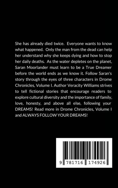She has already died twice. Everyone wants to know what happened. Only the man from the dead can help her understand why she keeps dying and how to stop her daily deaths. As the water depletes on the planet, Saran Moorlander must learn to be a True Dreamer before the world ends as we know it. Follow Saran's story through the eyes of three characters in Drome Chronicles, Volume I. Author Veracity Williams strives to tell fictional stories that encourage readers to explore the importance of family, love, honesty, and above all else, following your DREAMS! Read more in Drome Chronicles, Volume I and ALWAYS FOLLOW YOUR DREAMS!