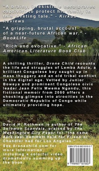 Lemba Adula is the perfect 15-year-old--brilliant, hardworking and polite to his elders. He excels at flying drones and coaxing new tricks out of smartphones and computers. But murderous Congolese rebels kidnap Lemba and force him to kill. He also must train other child soldiers and even help hijack a giant container ship. Drone Child is a powerful thriller and adventure story recommended for mature readers aged 18 and above. Younger readers should receive guidance and engage in dialogue with parents, teachers or librarians due to the book's mature content. Sex traffickers kidnap Lemba's sister, a gifted rumba singer, highlighting a real-life crisis in the Democratic Republic of the Congo. Also, Drone Child contains elements of violence. The novel includes satirical passages that critically address the inhumanity of violence-loving individuals. Lemba is a crack shot both on the firing range and when hunting for food. At the same time, he's far from the typical action hero and empathizes with the families of the people he must kill. For authenticity and cultural sensitivity, author David H. Rothman enlisted the expertise of two Congolese fact-checkers. Junior Boweya is a translator, software localization expert, and businessman. Jean Felix Mwema Ngandu is a former Mandela Washington Fellow and prominent civic activist in the Democratic Republic of the Congo. Both experts endorse the book and hope for translations into Lingala and French. Rothman has long been interested in issues affecting developing countries, especially technological ones. Positive reviews have appeared in Kirkus, The Midwest Book Review, and the American Library Association's Booklist. "A hefty tapestry interwoven with the possibilities for change," says the African American Literature Book Club. "In the context of our current times, this is a hope worth having." The second edition includes a new cover and a discussion guide for book clubs, parents, teachers and librarians. Drone Child also offers an informative section that compares events in the book with real happenings in the Congo. Additionally, the war in Ukraine makes this thriller more relevant than ever due to the moral questions that arise regarding drones and war in general, including atrocities against civilians. Don't miss out! Read Drone Child and dive into Lemba's captivating journey.