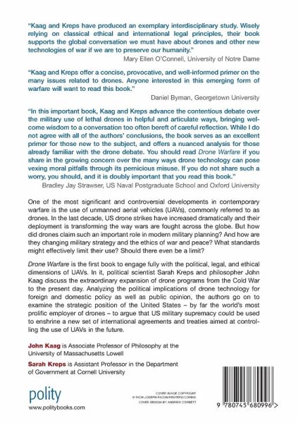 Drone warfare is the first book to engage fully with the political, legal, and ethical dimensions of UAVs. In it, political scientist Sarah Kreps and philosopher John Kaag discuss the extraordinary expansion of drone programs from the Cold War to the present day and their so-called 'effectiveness' in conflict zones. Analysing the political implications of drone technology for foreign and domestic policy as well as public opinion, the authors go on to examine the strategic position of the United States - by far the world's most prolific employer of drones - to argue that US military supremacy could be used to enshrine a new set of international agreements and treaties aimed at controlling the use of UAVs in the future.