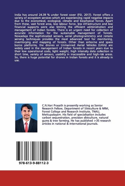 India has around 24.39 % under forest cover (FSI, 2017). Forest offers a variety of ecosystem services which are experiencing rapid negative impacts due to the economical, ecological, climatic and biophysical forces. Apart from these, vast forest area, low labour force, less infrastructure and low financial supports were also limiting the efficient administration and management of Indian forests. There is an urgent need for collection of accurate information for the sustainable management of forests. Nowadays the sophisticated sensors, aerial photogrammetry and remote sensing techniques provides the most advanced tool for monitoring, inventorying and mapping of forests. Other than airborne and space borne platforms, the drones or Unmanned Aerial Vehicles (UAVs) are widely used in the management of Indian forests in recent years due to their low operational costs, light weight, high intensity data collection in short time, variety of sensors, usability in inaccessible and high-risk areas. So, there is huge potential for drones in Indian forests and it is already in use.