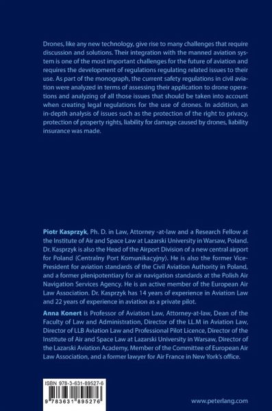 Drones, like any new technology, give rise to many challenges that require discussion and solutions. Their integration with the manned aviation system is one of the most important challenges for the future of aviation and requires the development of regulations regulating related issues to their use. As part of the monograph, the current safety regulations in civil aviation were analyzed in terms of assessing their application to drone opera-tions and analyzing of all those issues that should be taken into account when creating legal regulations for the use of drones. In addition, an in-depth analysis of issues such as the protection of the right to privacy, protection of property rights, liability for damage caused by drones, liability insurance was made.
