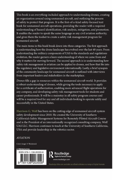 The main items in this book break down into three categories. The first approach is understanding how the drone landscape has evolved over the last 40 years. From understanding the military components of UAS to the standards and regulations evolution, the reader garners a keen understanding of where we came from and why it matters for moving forward. The second approach is in understanding how safety riskmanagement in aviation can be applied to drones, and how that fits into the regulatory and legislative environment internationally. Lastly, a brief synopsis of the community landscape for unmanned aircraft is outlined with interviews from important leaders and stakeholders in the marketplace.