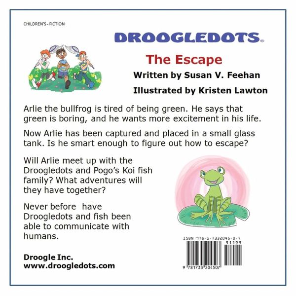 This revised edition of the Droogledots book #5 contains extra pages which include: bullfrog information, word meanings, a quiz, and an advice page from Papa Droogledot. Droogledot stories weave life lessons into each story mixed with a good serving of fantasy.