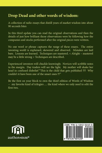Drop Dead and other words of wisdom: A collection of radio essays that distill years of market wisdom into about 90 seconds bites In this third update you can read the original observations and then the details of just how brilliant those observations were by following how the companies and stocks performed after the original pieces were written. No one word or phrase captures the range of these essays. The entire investing world is explained, skewered and observed. Mistakes are laid bare. Lessons are learned. Techniques are mastered. Techniques are described. Experienced investors will chuckle knowingly. Novices will scribble notes in the margin. Day traders will see the light. My mother will shake her head in confused disbelief "This is the child that gets published ??? Why couldn't it have been one of the smart ones ??" Be the first on your block to own the third edition of Words of Wisdom -- my favorite kind of trilogies . the kind where we only need to edit the first two.