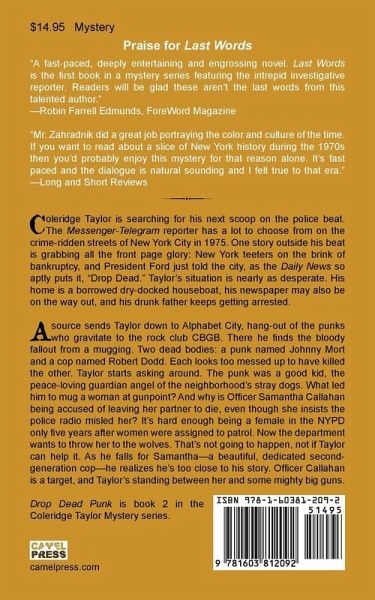 Coleridge Taylor is searching for his next scoop on the police beat. The Messenger-Telegram reporter has a lot to choose from on the crime-ridden streets of New York City in 1975. One story outside his beat is grabbing all the front page glory: New York teeters on the brink of bankruptcy, and President Ford just told the city, as the Daily News so aptly puts it, "Drop Dead." Taylor's situation is nearly as desperate. His home is a borrowed dry-docked houseboat, his newspaper may also be on the way out, and his drunk father keeps getting arrested. A source sends Taylor down to Alphabet City, hang-out of the punks who gravitate to the rock club CBGB. There he finds the bloody fallout from a mugging. Two dead bodies: a punk named Johnny Mort and a cop named Robert Dodd. Each looks too messed up to have killed the other. Taylor starts asking around. The punk was a good kid, the peace-loving guardian angel of the neighborhood's stray dogs. What led him to mug a woman at gunpoint? And why is Officer Samantha Callahan being accused of leaving her partner to die, even though she insists the police radio misled her? It's hard enough being a female in the NYPD only five years after women were assigned to patrol. Now the department wants to throw her to the wolves. That's not going to happen, not if Taylor can help it. As he falls for Samantha-a beautiful, dedicated second-generation cop-he realizes he's too close to his story. Officer Callahan is a target, and Taylor's standing between her and some mighty big guns. Drop Dead Punk is book 2 in the Coleridge Taylor Mystery series.
